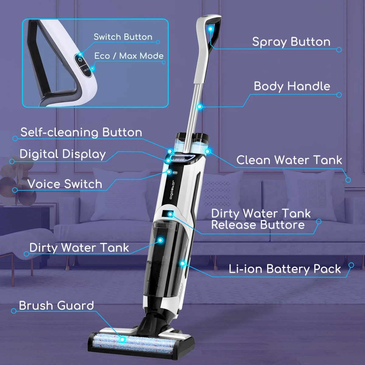 De Aigostar Whale draadloze steelstofzuiger is een krachtige Vloerreiniger met een dubbele werkmodus voor stofzuigen en dweilen, waardoor het gemakkelijk is om nat en droog vuil schoon te maken. De krachtige zuigkracht ruimt met gemak vlekken van de vloer op. Bovendien wordt het geleverd met een knop voor de zelfreinigende functie, waardoor je je het niet handmatig hoeft te demonteren en schoon te maken. Ontzorg jezelf en focus op het schoonmaken. Daarnaast is deze Vloerreiniger voorzien van een LED-display en is het gemakkelijk te gebruiken met de gesproken instructies.