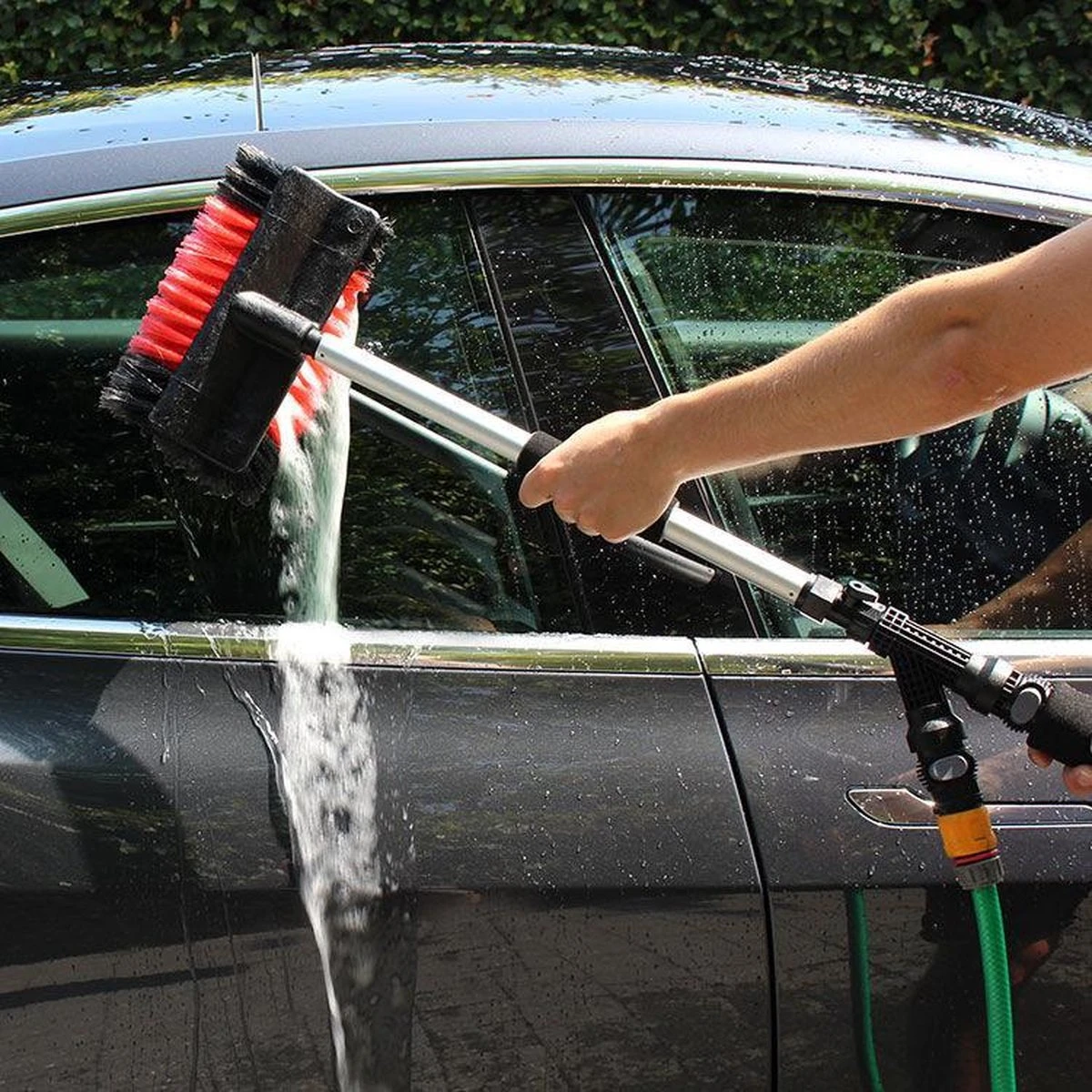 Dankzij de waterdoorlatende autowasborstel met zeepdispenser krijg je je auto in een mum van tijd schoon waardoor je nooit meer naar de carwash moet gaan. Dankzij de korte steel kan je meer kracht zetten, wat ideaal is om bijvoorbeeld je velgen grondig te wassen. De haren van de borstel zijn speciaal ontworpen om de auto krasvrij schoon te maken. Daarnaast maak je snel een groot oppervlak schoon dankzij de gekantelde borstelvlakken.