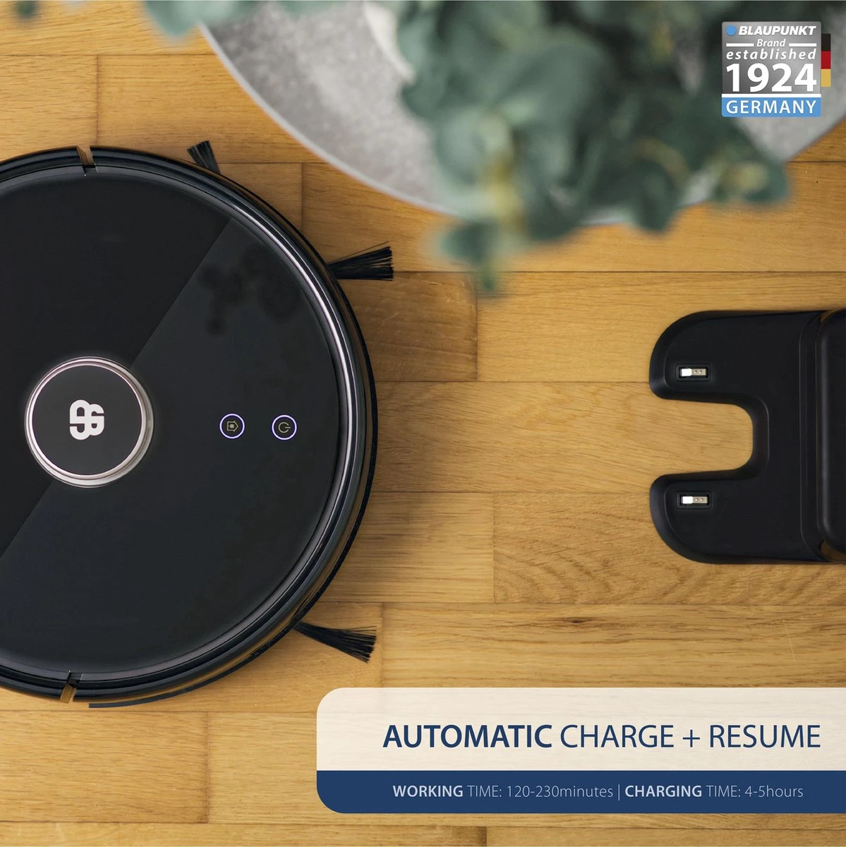 - Is de batterij bijna leeg tijdens een schoonmaak, dan laadt de robot automatisch op en gaat hij daarna verder met de schoonmaak.