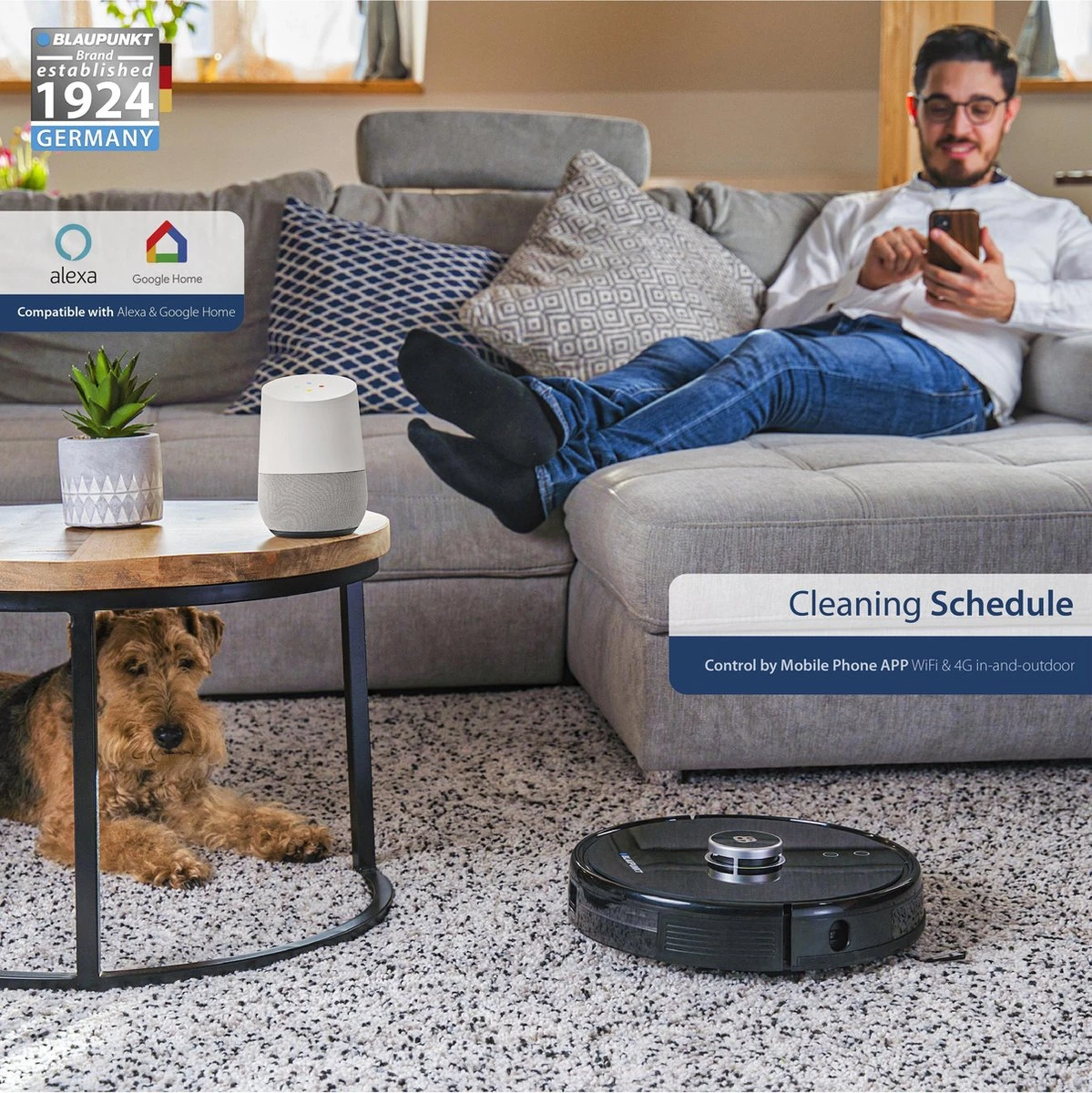 Bij een slimme robot horen slimme apparaten. De robot kan gekoppeld en aangestuurd worden via Google Home en Alexa. Gemak dient de mens!