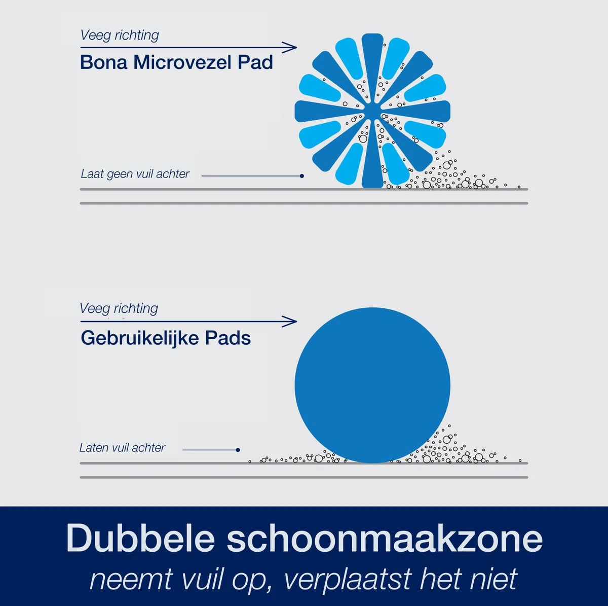 De Bona microvezel pad heeft een uniek ontwerp met twee verschillende schoonmaak vlakken. De donkerblauwe vezels aan de buitenkant lossen vet op en de lichtblauwe vezels aan de binnenkant nemen het vuil op. Bona gebruikt daarnaast zeer fijne vezels die er voor zorgen dat jouw vloer schoner wordt dan ooit te voren.