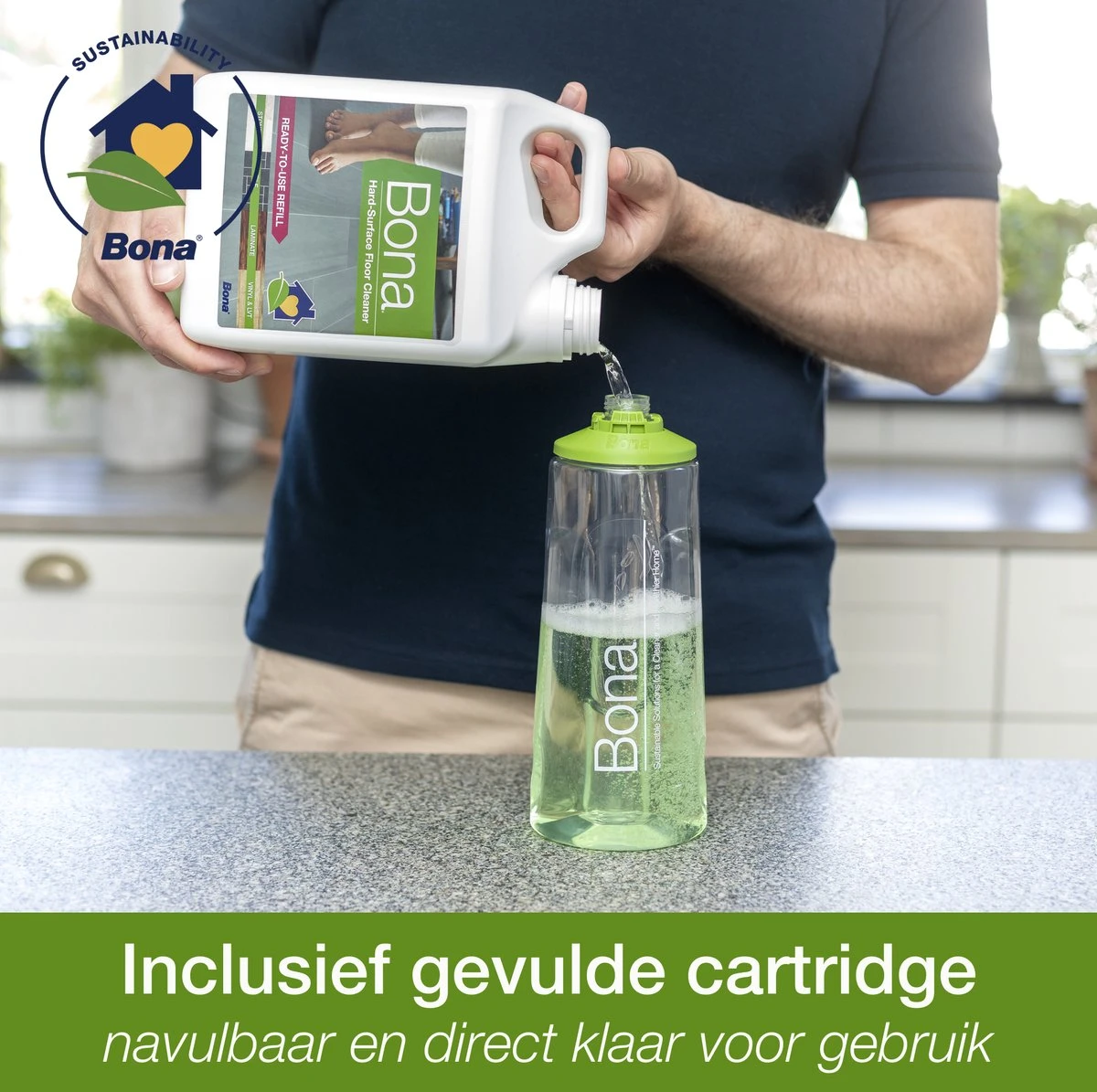 - INCLUSIEF 0,85 L BONA HARDE VLOER, TEGEL EN LAMINAAT REINIGER (T.W.V. €14,95) – zodat je zonder water toe te voegen direct kan beginnen. Daarnaast zul je met de reiniger geen vlekken meer hebben, droogt de vloer snel en streeploos op en is het veilig voor kinderen en huisdieren door de watergedragen formule.
