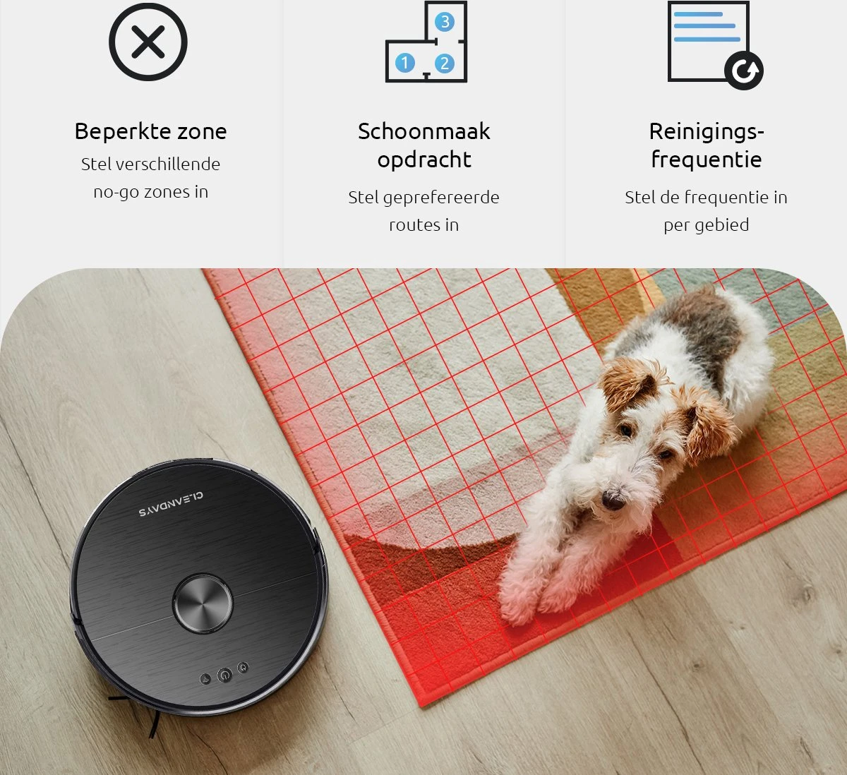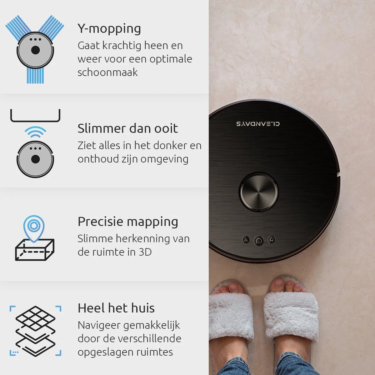 De CleanDays XR500 Robotstofzuiger met geavanceerde dweilfunctie & LASER Navigatie Is er een van het hoogste niveau. Dankzij de intelligente Smart 360° Laser-Radar met LDS én SLAM technologie maakt deze robot super nauwkeurig schoon. Via de kaart in de app welke het apparaat in real-time maakt kunnen in de app NO-GO-zones gemaakt worden en zal de robot objecten perfect ontwijken. Dankzij het driedubbele HEPA-filtersysteem is deze robot ook ideaal voor mensen met allergieën. De hoge zuigkracht met tapijt sensor en turbo boost, dubbele zijborstels en midden borstel geven dierenharen geen kans. Met een supersterke accu van 3200 mAh kan tot wel 3 uur of 230 m2 schoongemaakt worden en als dat niet genoeg is, dan laadt de robot zich vanzelf op en gaat dan weer verder waar deze gebleven was.