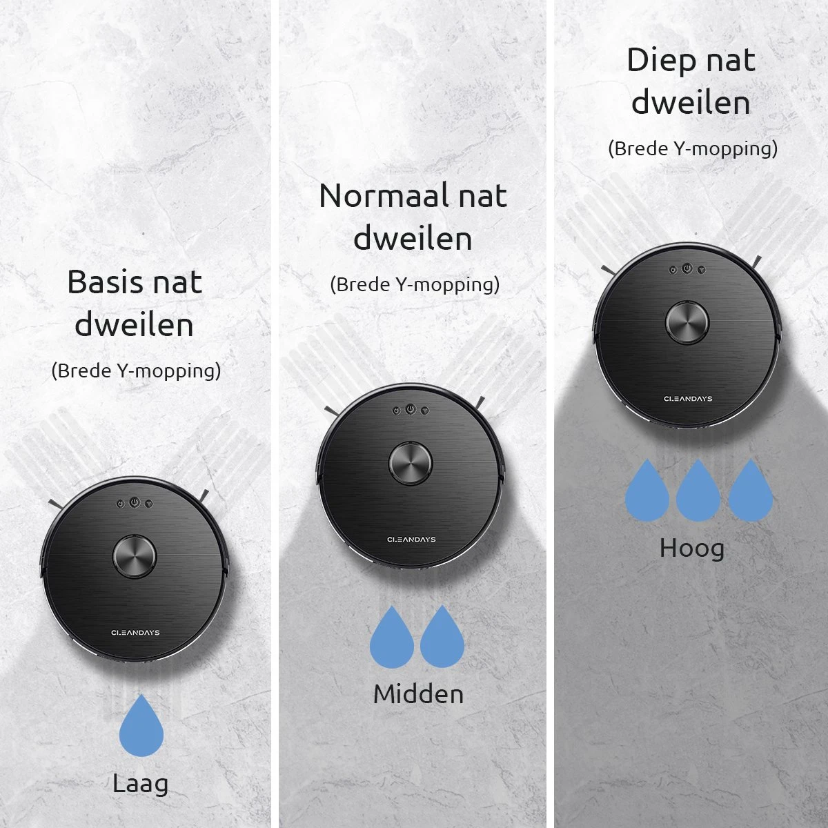 Unieke functie voor nat dweilen – Het gebruikt de nieuwste methode om de vloer te dweilen, Y-vormig heen en weer vegen, dit maakt de diepste reiniging in vergelijking met andere normale reiniging. En de robot heeft een elektronisch gestuurde watertank met grote capaciteit, waardoor je naar eigen wens de hoeveelheid waterafgifte kunt instellen.
