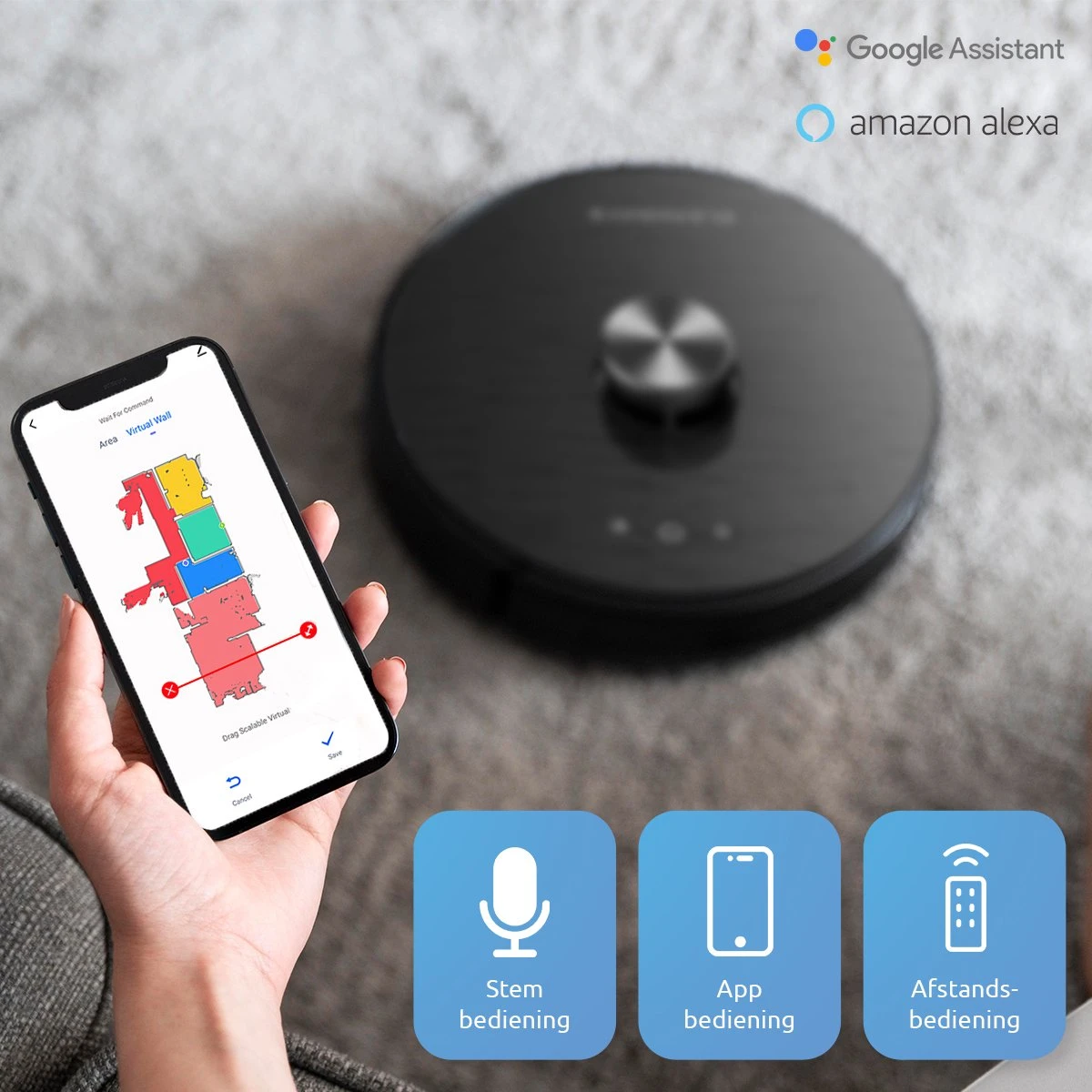APP – Afstandsbediening en visuele reiniging, U kunt afspraken plannen op de APP, of de zuigkracht aanpassen, de robot verbinden met Alexa en Google Assistant, enz.