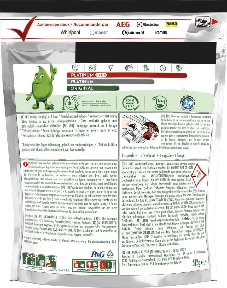 Dreft Platinum Plus All In One Vaatwastabletten bieden je een uitzonderlijk schone vaat in slechts korte tijd. Dreft Platinum Plus geeft je een uitmuntende reiniging en verwijdert hardnekkige voedselvlekken, zelfs in de testconditie van een korte cyclus. Dus als je weinig tijd hebt, dan is dat geen enkel probleem. Stap over op kort. Dreft combineert vloeistof en poeder in รฉรฉn krachtige tablet. Het ultra-oplosbare zakje lost snel op en werkt goed in korte cycli omdat het snel begint te reinigen om de klus klaar te krijgen. En ze zijn gemakkelijk te gebruiken. Plaats ze gewoon in het doseerbakje van je vaatwasser, met verpakking. Schakel over op de korte cyclus en bespaar tijd, energie en water in vergelijking met een gewone, standaard cyclus.
