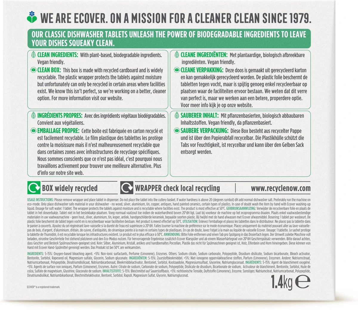 De Ecover Vaatwastabletten Classic zijn biologisch afbreekbare superhelden. Ze rekenen af met aangekoekte etensresten en vet dankzij de krachtige, plantaardige ingrediรซnten voor een sprankelend schone en streeploze vaat. En zoals altijd, zonder gebruik van fosfaten.