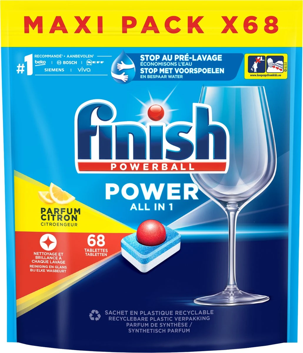 Deze verpakking bevat 68 Finish Power all in one citroen vaatwastabletten.