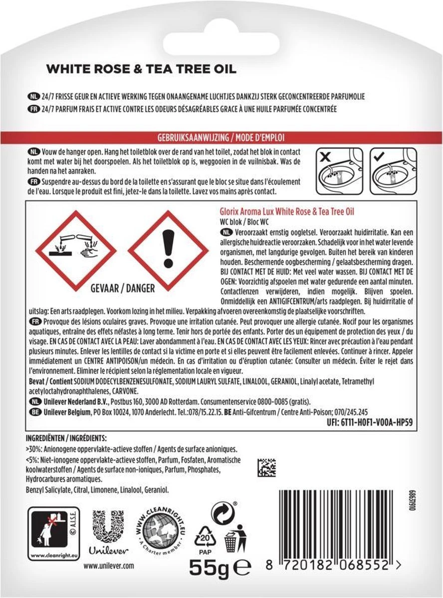 Glorix Aroma Lux Toiletblok White Rose & Tea Tree Oil is een nieuwe luxe geurende toiletverfrisser van het nummer 1 merk voor toiletreiniging in Nederland. Dit WC Blok geeft 24/7 een heerlijk frisse geur af en heeft een actieve werking tegen onaangename geurtjes dankzij sterk geconcentreerde parfumolie. Met het warme en aromatische parfum White Rose & Tea Tree Oil, aangevuld met de sensuele tonen van cederhout, amber en vanille, ruikt je WC altijd heerlijk fris! Bovendien zorgt Glorix Aroma Lux WC Blok bij elke spoelbeurt voor glans en hygiënische reiniging, waardoor je iedere dag geniet van een aangenaam geurend en schoon toilet. De hanger is bovendien 100% recyclebaar!