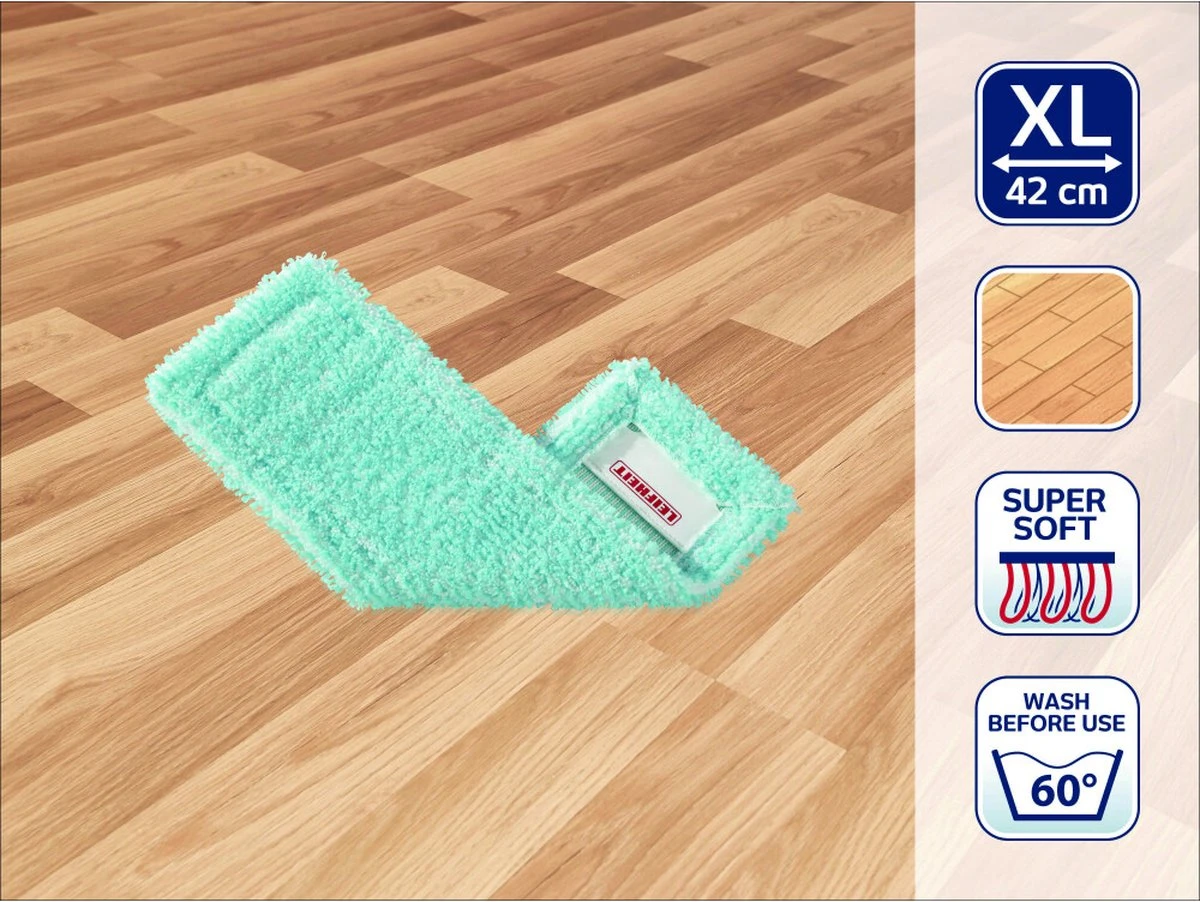 De Profi Extra Soft Overtrek van Leifheit is bijzonder geschikt voor kurk- laminaat- en parketvloeren. De speciale vezels van de doek nemen een minimum aan waterhoeveelheid op en beschermt door de slingerbeweging van de wisser uw kwetsbare vloeren. Hij is wasbaar tot 60Β°C en verliest ook na herhaaldelijk wassen niet aan reinigingskracht. Past perfect op de vloerwisser Profi (42 cm) van Leifheit.