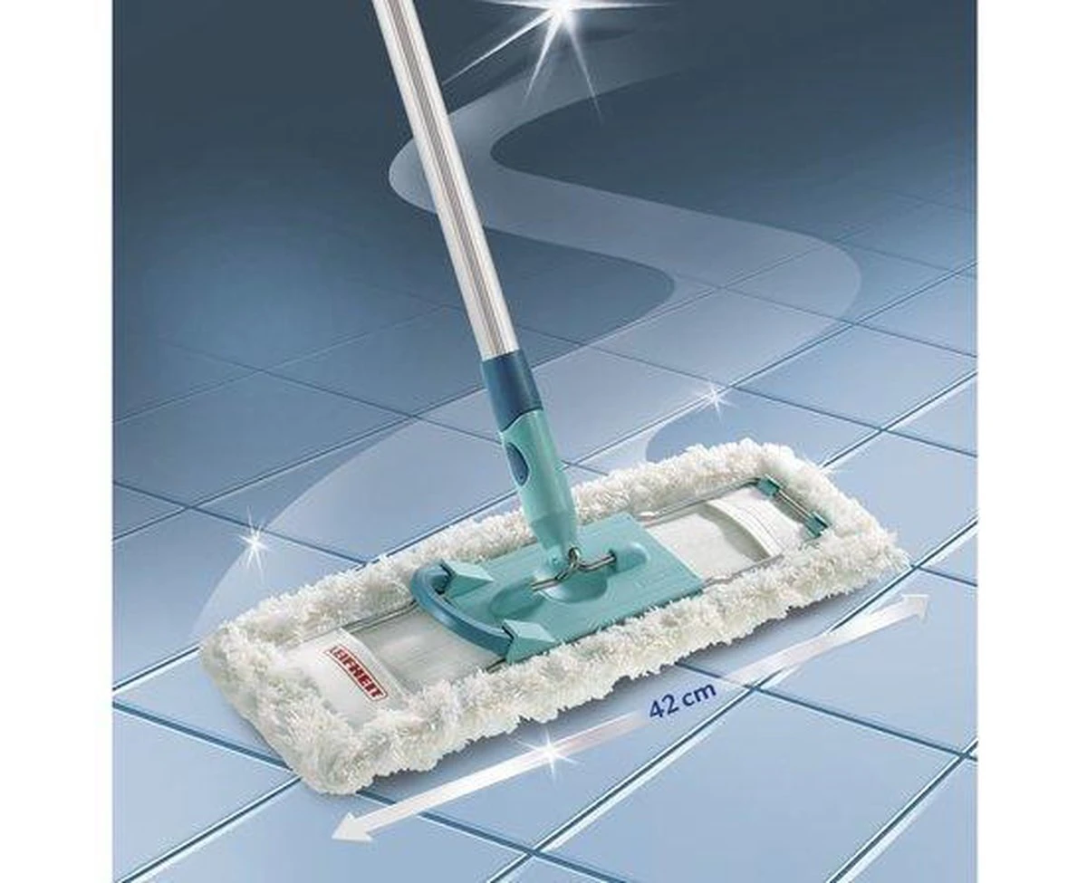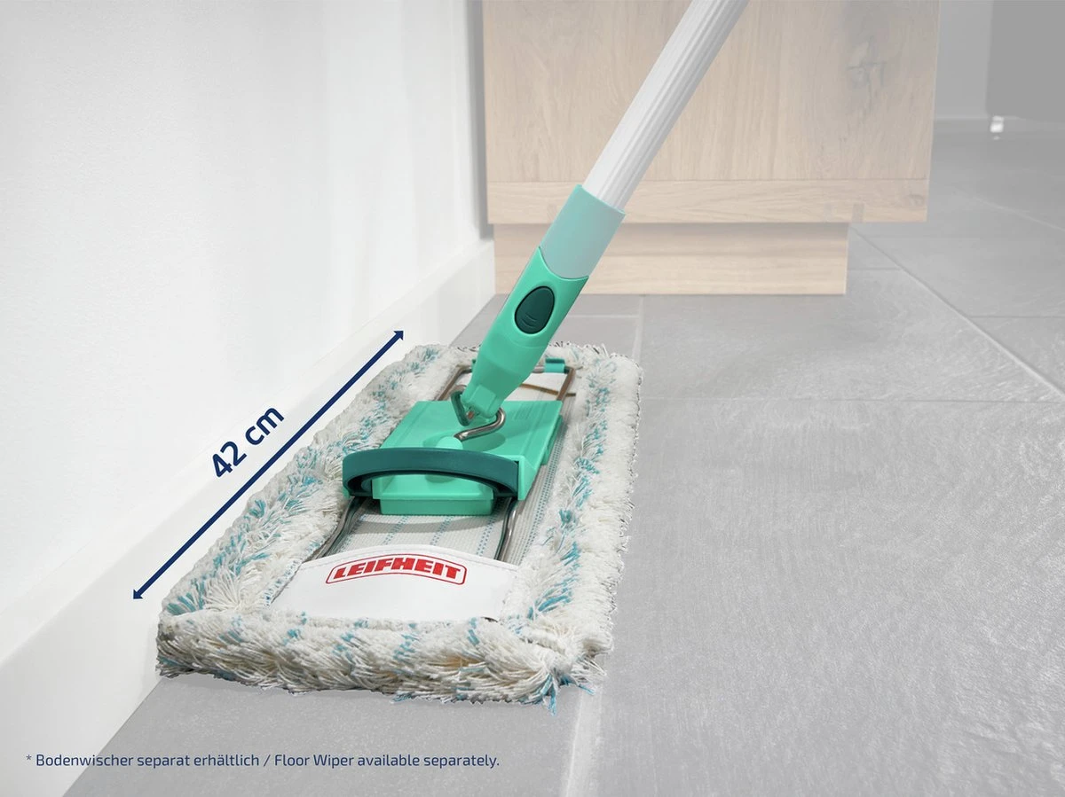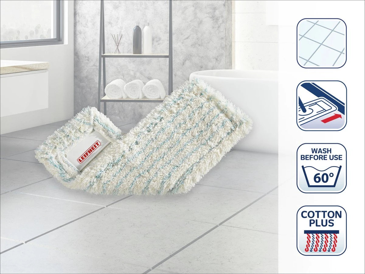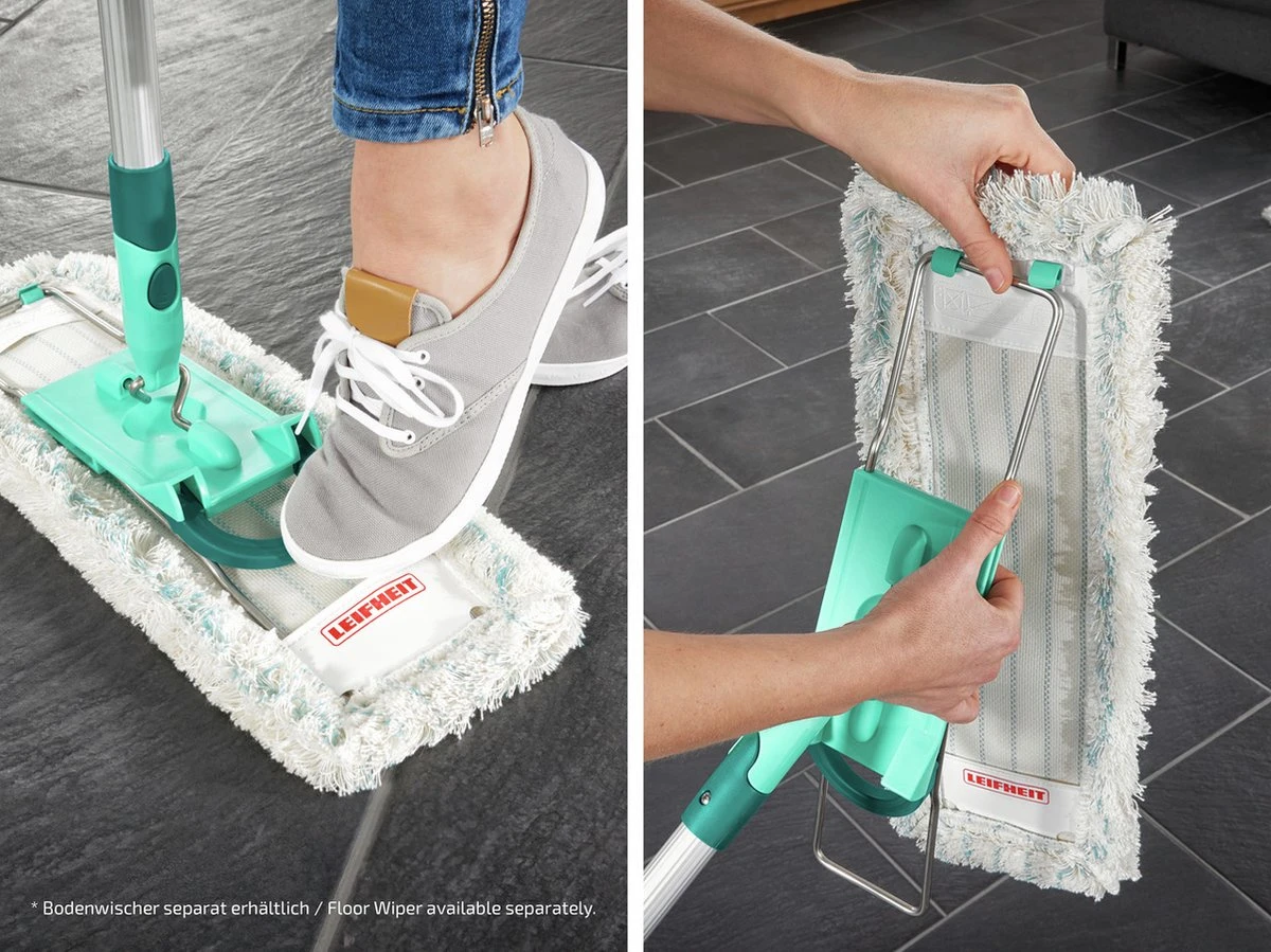 Perfecte reinigingsdoek voor stenen- en tegelvloeren: De Leifheit-vloerdoek Profi cotton plus bestaat uit een combinatie van supra- en katoenvezels. Als de supra vezels het vuil dit diep in de poriën verwijderen, nemen de katoenvezels het verwijderde vuil en het water op. De vloerdoek Profi cotton plus is wasbaar op 60°C en verliest ook na herhaaldelijk wassen zijn reinigingskracht niet. Bijzonder geschikt voor stenen vloeren en tegels, en zorgt zelfs bij grove vervuiling voor een briljante glans. Het bijpassende dweilsysteem is de vloerwisser Profi, die zonder bukken en met één voetklik bediend kan worden.