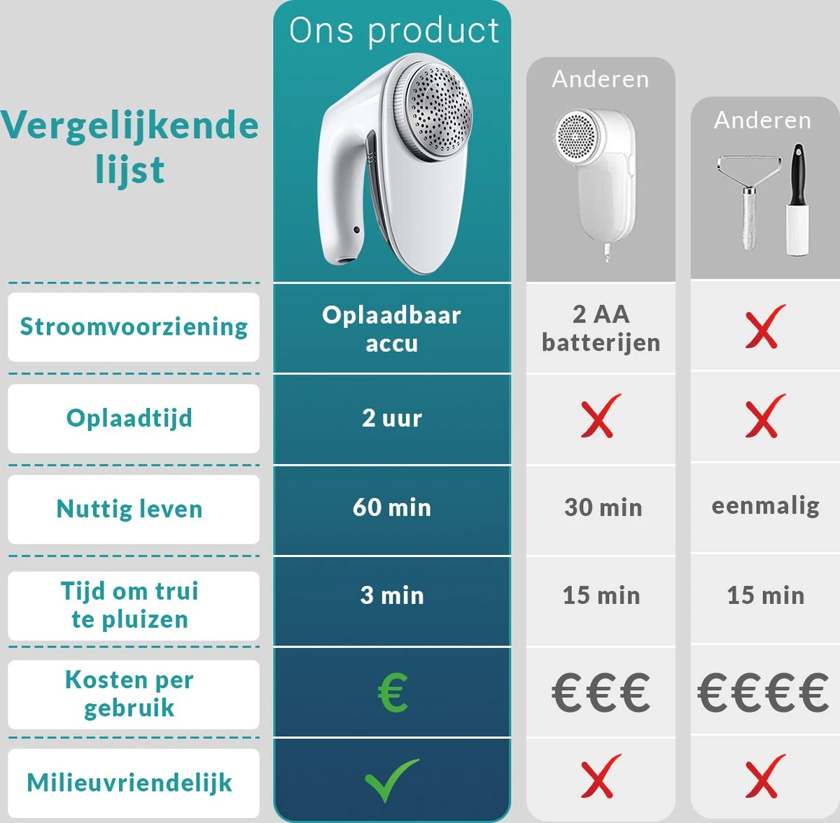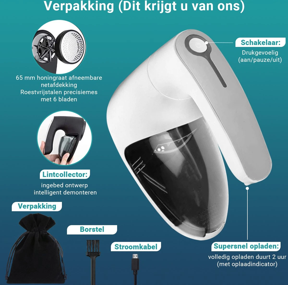 De ontpluizer maakt je favoriete kledingstukken of meubilair in 3 minuten weer zo goed als nieuw. Draadloos en 60 minuten non-stop te gebruiken. Van meubels tot dekbedden, door de 3 verschillende maasgrootten is de ontpluizer overal voor in te zetten. Makkelijk schoon te maken met het borsteltje en mee te nemen in de bijgevoegde opbergtas. De batterij van de ontpluizer is gewoon oplaadbaar, dus geen milieuonvriendelijke batterij verspilling!