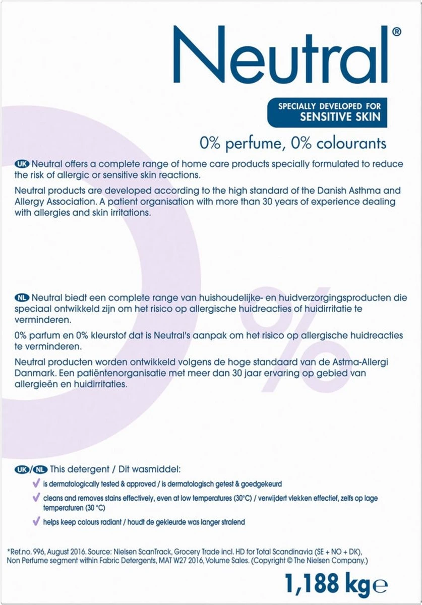 Neutral wasmiddel bevat geen bleekmiddel en is veilig en effectief ook bij lage temperaturen. Neutral bevat 0% parfum en 0% kleurstof en is bovendien dermatologisch getest.