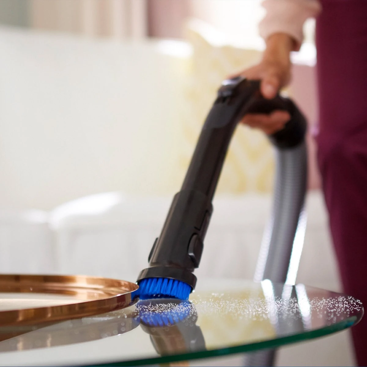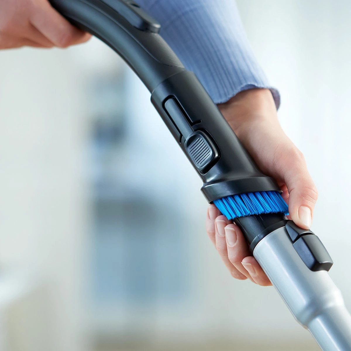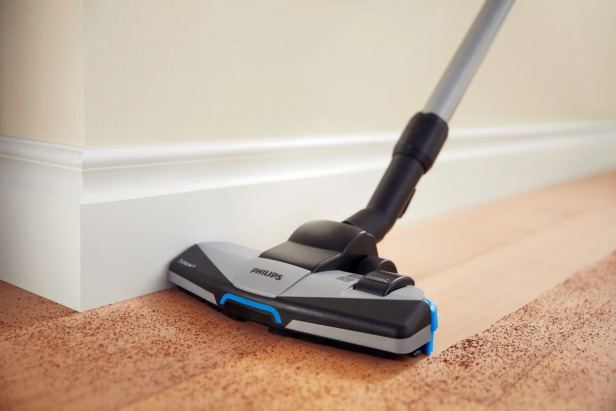 Het TriActive+-mondstuk voert 3 reinigingshandelingen in één keer uit. Aan de voorzijde zit een grotere opening om grotere vuildeeltjes op te zuigen, terwijl de speciaal ontworpen zoolplaat stof diep uit tapijt verwijdert. Luchtkanalen aan beide zijden van het mondstuk nemen stof en vuil op langs muren en meubels.