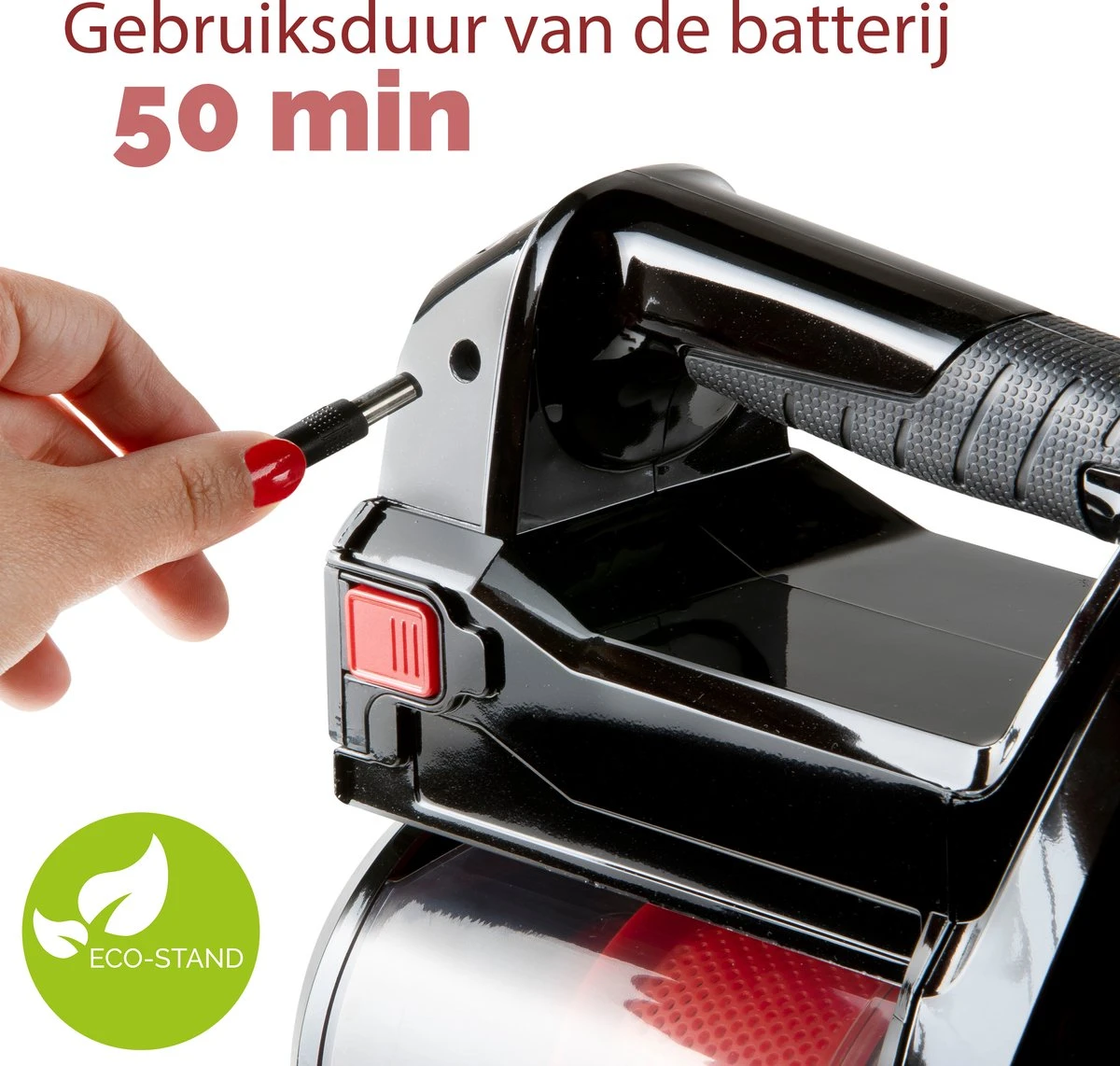 - Gebruiksduur: +/- 50 min. (ECO modus Kruimelzuiger) +/- 25 min. (Turbo modus + borstelkop)