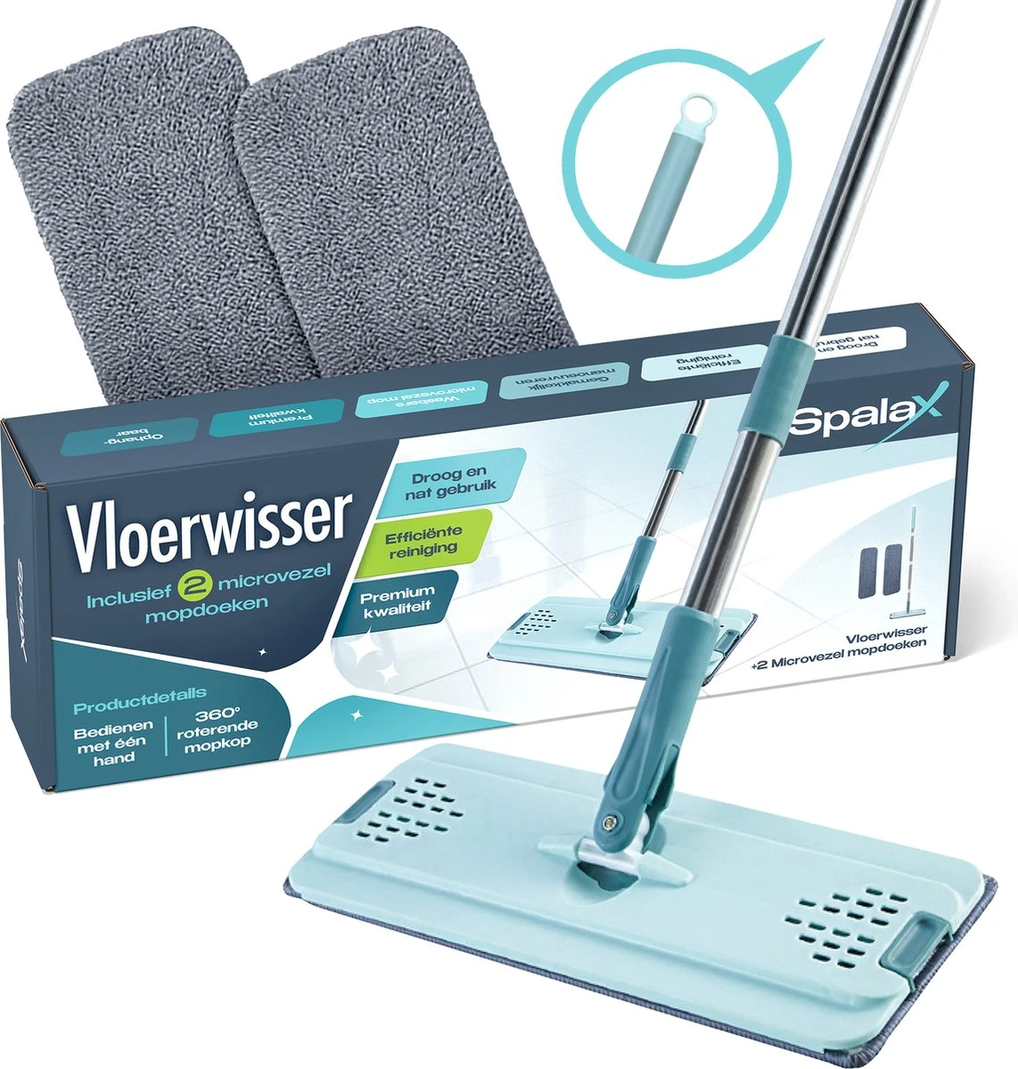 De ultraslank en duurzaam gebouwde vloermop wordt geleverd met 2 herbruikbare microvezel moppen. De mop kan droog en nat worden gebruikt voor het snel en efficiënt verwijderen van water, stof, olie, haar en vuil zonder sporen achter te laten. De microvezeldoeken zijn zowel met de hand als de machine te wassen. De doeken kunnen een lange tijd gebruikt worden zonder te beschadigen of vervormd te raken.