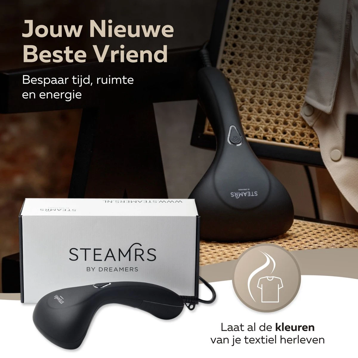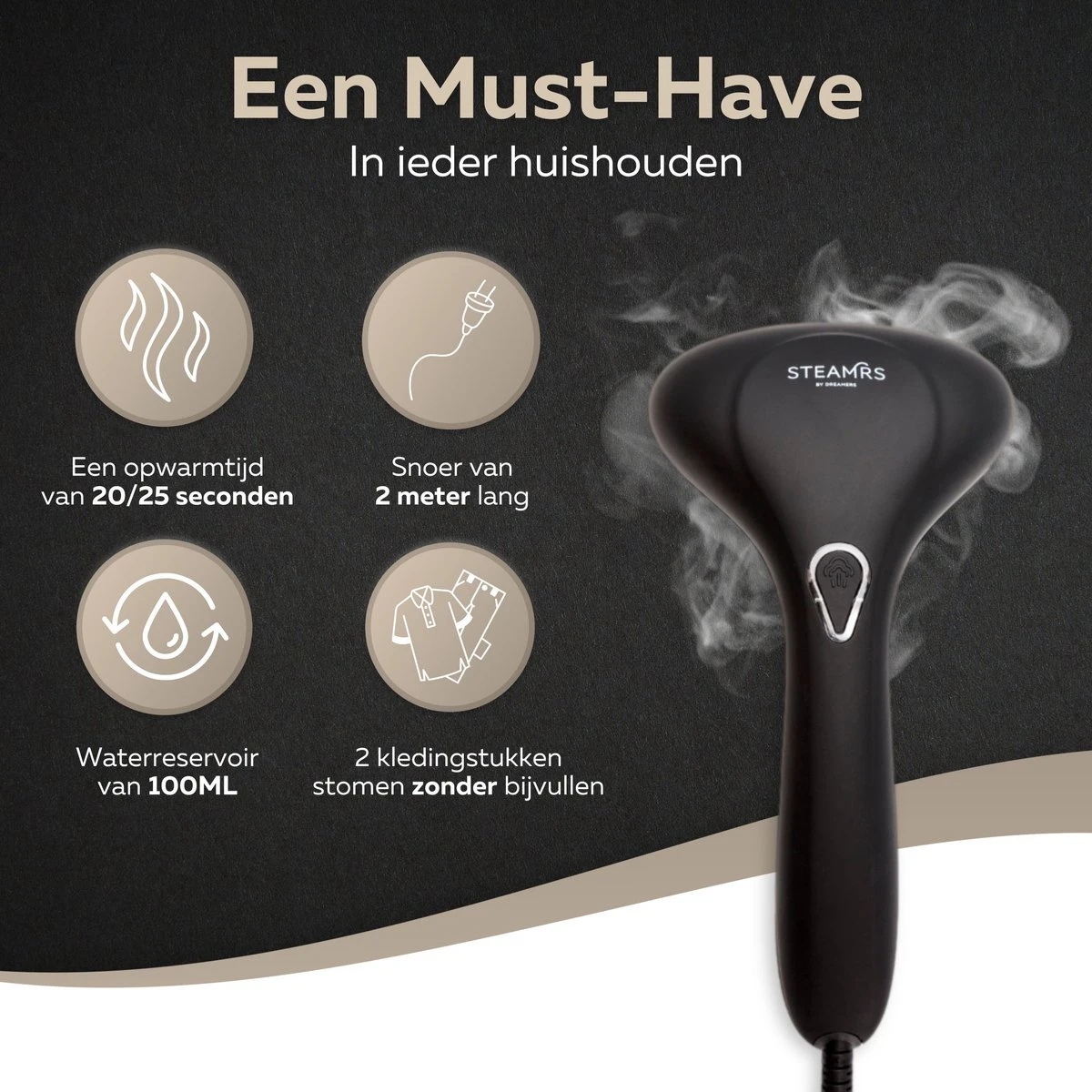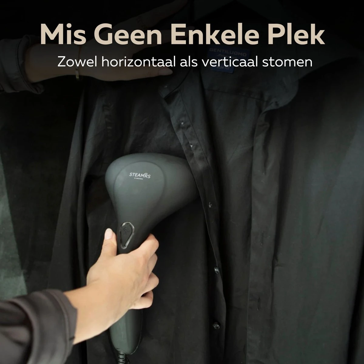 Stoom al je favoriete stoffen en kleding in seconden veilig hygiënisch en kreukvrij met deze stijlvolle, krachtige handstomer. Deze STEAM’R is een verademing en must-have voor in je huishouden en je drukke leven. Het chique mat-zwarte uiterlijk geeft de STEAM’R een premium gevoel. De roestvrijstale stoomkop is speciaal ontworpen om stoom gelijkmatig over textiel te verspreiden, zodat alle vouwen in één beweging glad gestoomd worden. Daarnaast laat je kleuren van textiel herleven en is het minder schadelijk dan gebruik van een strijkijzer.