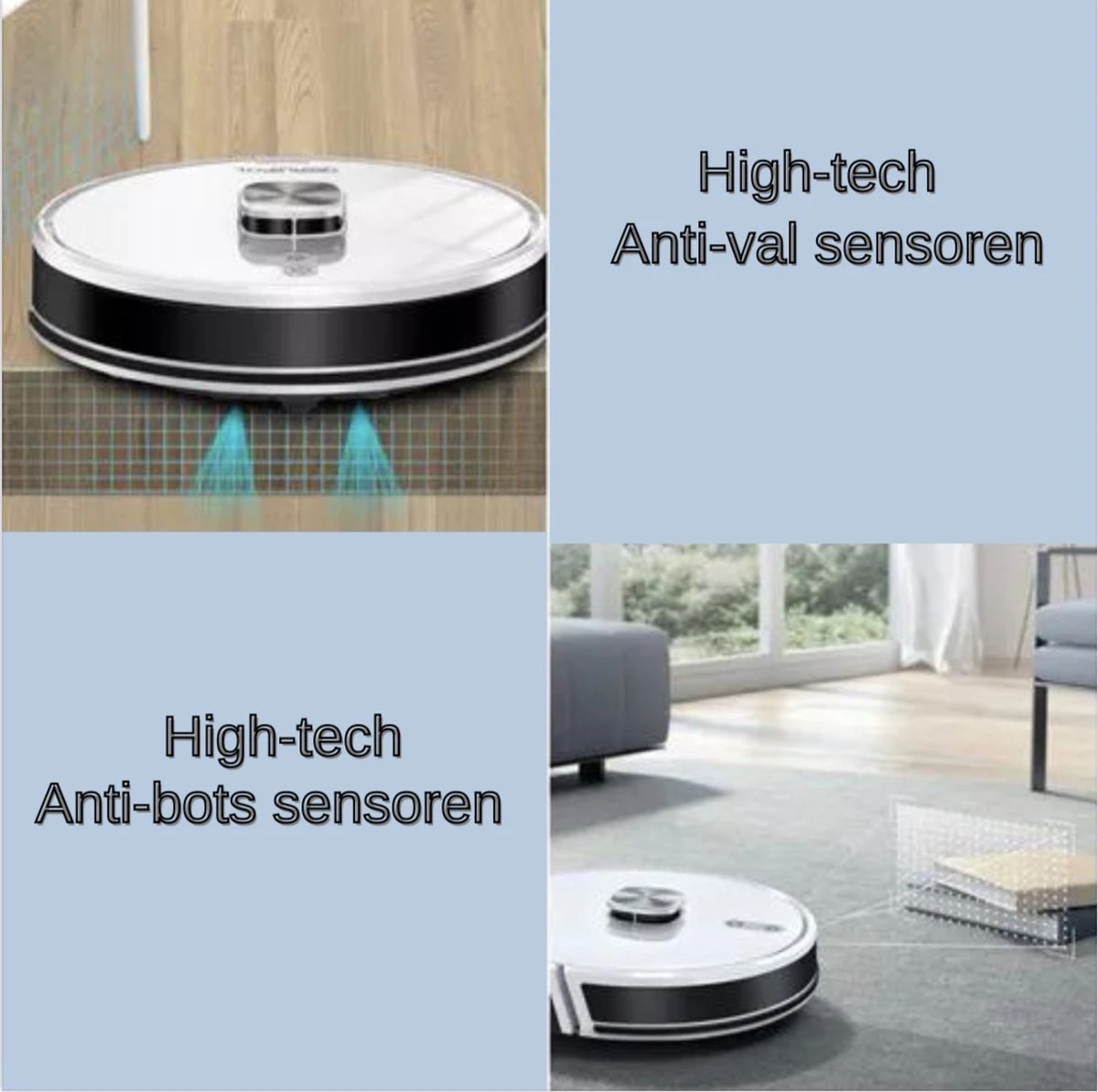 – De robotstofzuiger botst en valt niet doordat de nieuwste sensortechnologie wordt toegepast bij deze robot. Zo voorkomen we dat hij van de trap afvalt of dat hij bots schade aan uw inboedel maakt.