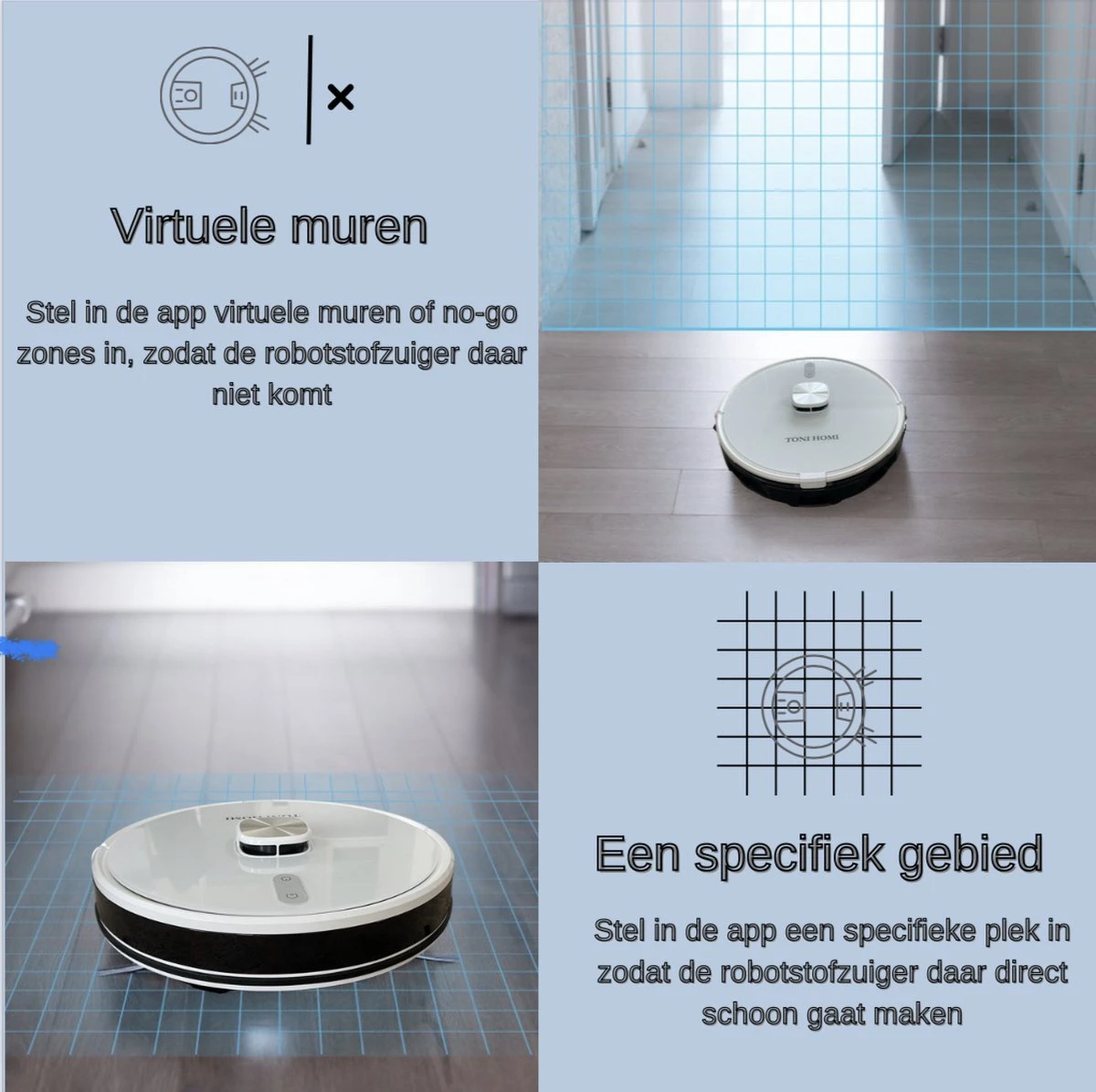 De TONIHOMi V8 robotstofzuiger met dweilfuntie behoort met zijn innovatieve functies tot de beste robotstofzuigers van 2023. De V8 beschikt over een slimme 360° Laser-Radar met LDS én SLAM technologie. Uw woonkamer of een dergelijke ruimte zal de V8 robotstofzuiger in zijn geheel scannen wat u vervolgens terug kunt zien in de app op uw telefoon. Zo kunt u ten aller tijden zien waar de robotstofzuiger zich bevindt of dat nou bij zijn station is of in beweging u houdt altijd het overzicht in de app. In de app kunt u de robotstofzuiger ook gemakkelijk verder instellen. Zo kunt u een schoonmaakprogramma aanmaken, waarbij u de schoonmaak dagen aangeeft en de gewenste tijd van die dag. Als u plekken heeft waar de robotstofzuiger niet mag zuigen of dweilen kunt u gemakkelijk in de gescande kaart in uw app verboden gebieden aangeven zodat de robotstofzuiger dat aangegeven gebied vermijd. Met de 5000 PA sterke zuigkracht zuigt de V8 gemakkelijk borrelnoten, broodkruimels en hondenharen op. Met de krachtige ingebouwde motor is niks de robotstofzuiger teveel. Door de ingebouwde geluidsdempers is de stofzuiger vrijwel geruisloos. De robotstofzuiger beschikt over een exclusieve lithium-accu waardoor hij tot wel 240m2 kan stofzuigen of dweilen achter elkaar. Nadat de robotstofzuiger zijn schoonmaakbeurt erop zit zal hij automatisch terugkeren naar zijn station waar hij automatisch wordt leeg gezogen en vervolgens wordt opgeladen voor zijn volgende schoonmaakbeurt.