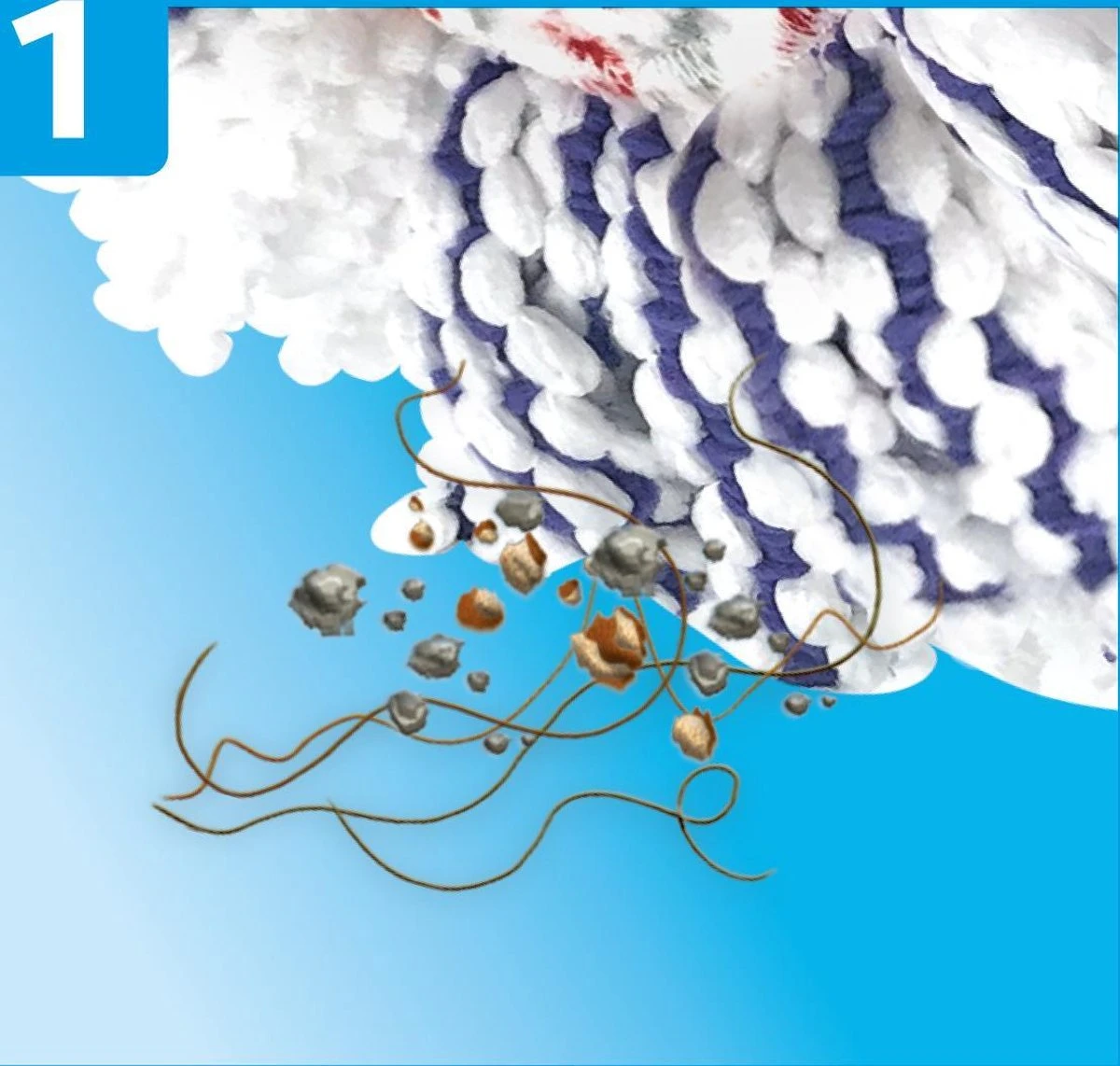De 3in1 vervanging wordt voornamelijk gekenmerkt door zijn grote reinigingsvermogen. De mop verwijdert tot 99% van de bacteriën* op uw vloer en dat met water alleen. Maak in alle veiligheid schoon, zonder gebruik te maken van reinigingsmiddelen of agressieve chemische producten. De grote reinigingskracht wordt verkregen dankzij de innoverende combinatie van franjes in microvezels en een centrale pad die zelfs het meest hardnekkige vuil verwijdert.* Verwijdert E. coli en staphylococcus aureus van harde en tegelvloeren, getest door een onafhankelijk laboratorium