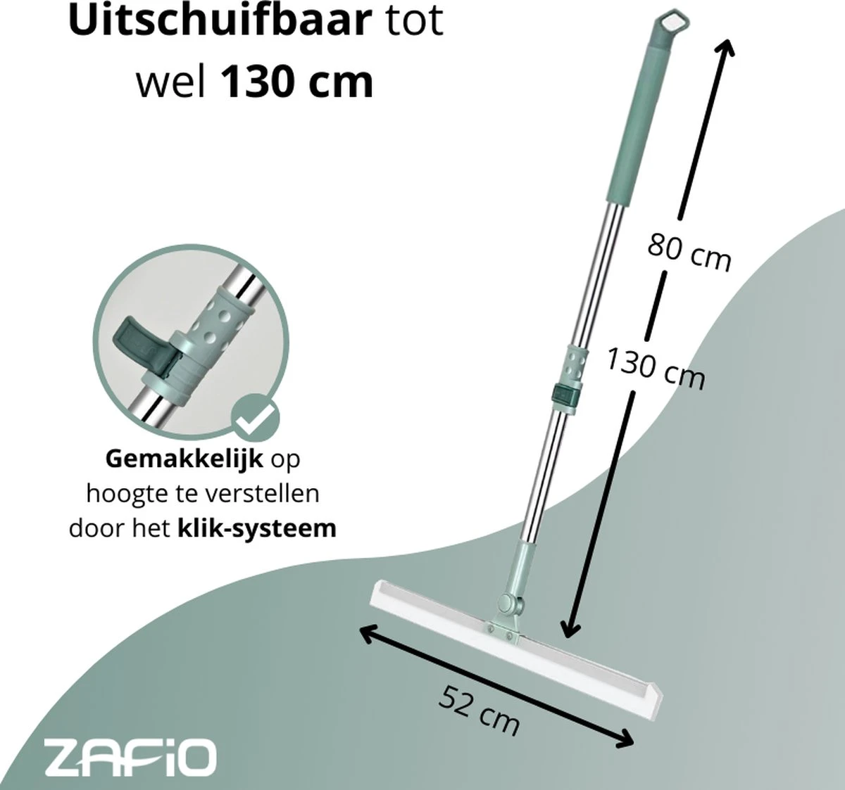 Zafio vloertrekker met steel die uw badkamer, douche en ramen goed en netjes droogmaakt. De vloerwisser is verstelbaar van 80 t/m 130 cm en is 52cm breed, speciaal om alles goed droog te maken. De watertrekker van Zafio is 180 graden draaibaar en kunt u zowel gebruiken voor de vloer als voor uw ramen, multifunctioneel dus.
