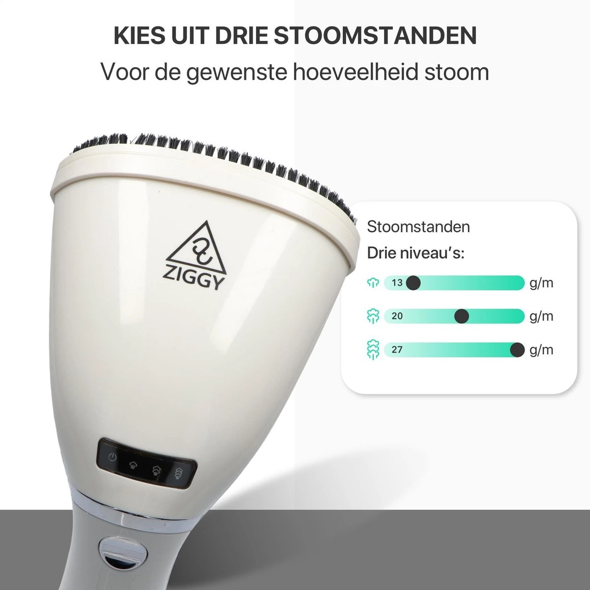 De kledingstomer kan worden ingesteld op 3 standen en is na 15 seconde klaar voor gebruik. De stomer heeft een groot waterreservoir van 280 ML waarmee je tot wel 20 minuten kunt stomen, hierdoor kan je gemakkelijk alles in één keer stomen. Het mondstuk van de Ziggy kledingstomer is extra breed waardoor je snel grotere oppervlaktes kunt stomen. Bovendien is deze zo ontworpen dat de geproduceerde stoom zich zo evenredig mogelijk verdeeld.