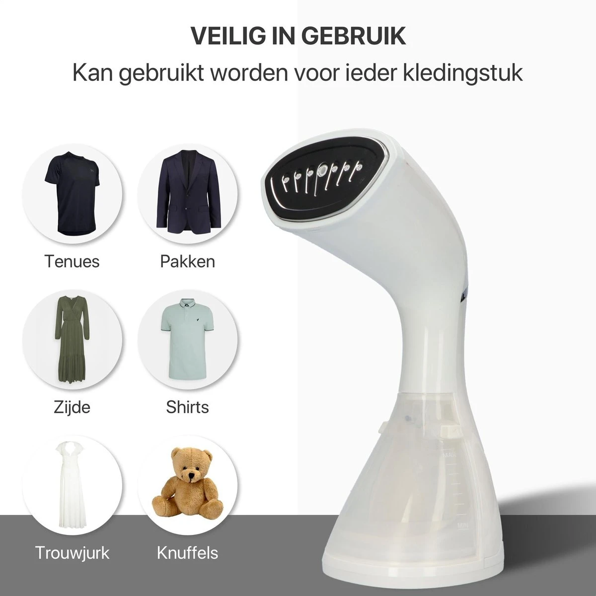 De kledingstomer kan je voor alle soorten stof en textiel gebruiken, van zijden overhemden tot jurken en van dekens tot knuffeldieren. De stoomreiniger is zo ontworpen dat deze perfect in de hand ligt en je er eenvoudig mee kan werken. Bovendien is de stomer veilig te gebruiken dankzij de oververhittings- en spanningsbeveiliging en is daarnaast 100% spatvrij. Hierdoor is vocht op kleding of verbranding van fijne kwetsbare stoffen uitgesloten.